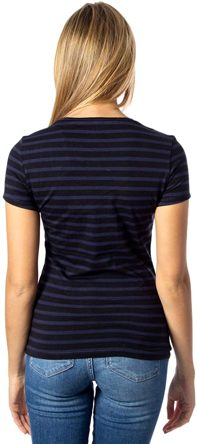 - Camiseta rayada de colores negro y azul oscuro con logotipo frontal en blanco perlado.